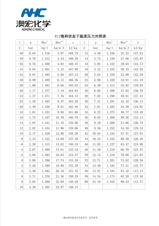 R12制冷劑飽和狀態(tài)下溫度壓力對比表